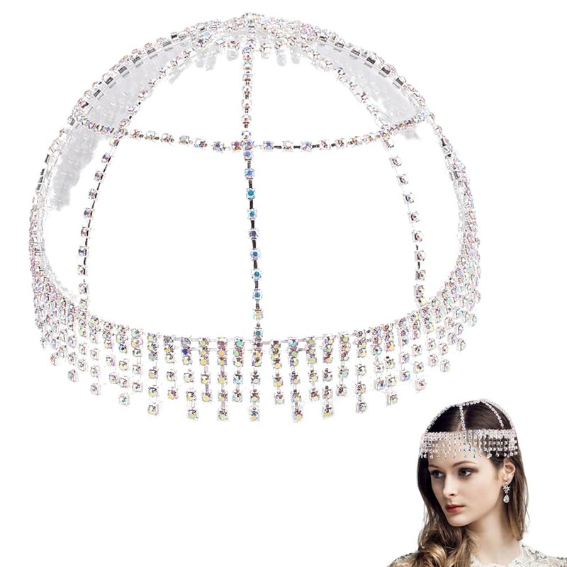 GORGECRAFT Headgear with Tassel and Crystal Rhinestone Multilayer Head Chain Mesh Roaring Jewellery Sparkling Bridal Headbands Wedding and Prom Hair Flapper Caps Headscarf for Women, Alloy, rhinestone