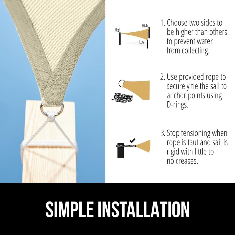 Durable 13 foot long, thick PE rope included for easy install. Sails are a great option for your patio, deck, garden, and more.