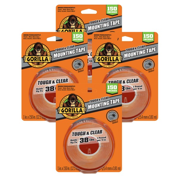 Gorilla Tough & Clear Double Sided Mounting Tape, Clear Tape, 1" x 150" (Pack of 4) - Weatherproof for Indoor or Outdoor