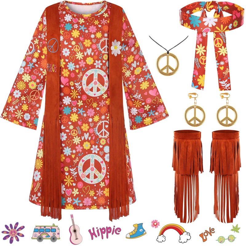 - Complete Hippie Ensemble: The Girls' Hippie Costume includes a dress with a non-detachable fringe vest, a pair of fringe leg sleeves, a hippie headband, a peace sign necklace, peace sign earrings, and 10 hippie-themed tattoo stickers for a groovy transformation.