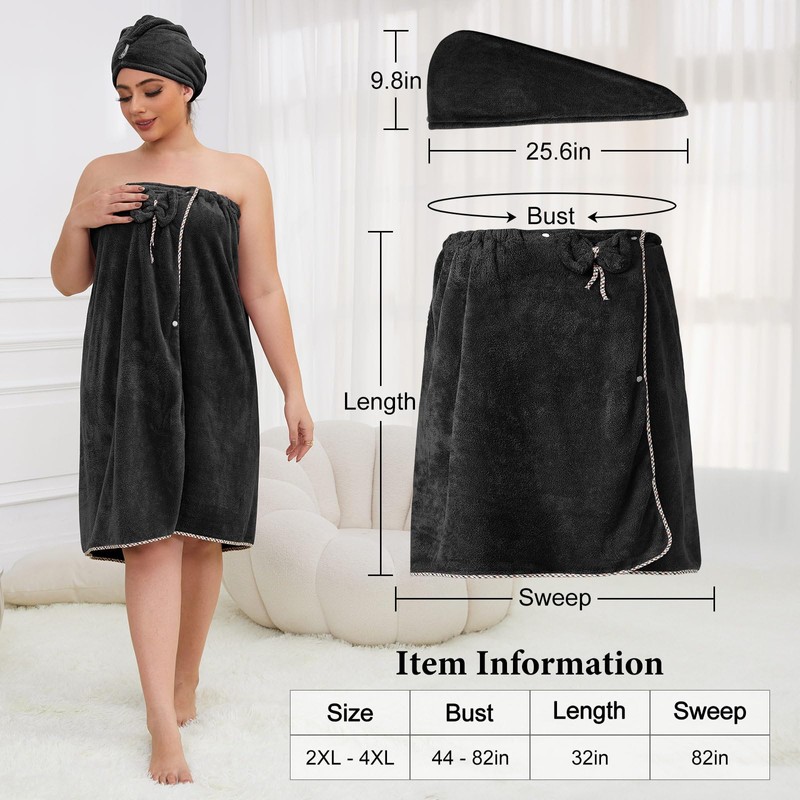GOSCHE Towel Wrap for Women Plus Size (XXL-XXXXL) with Hair Towel Wrap, Velcro Spa Shower Wrap Towel, Adjustable Closure Bath Wrap Oversized Towel, Black