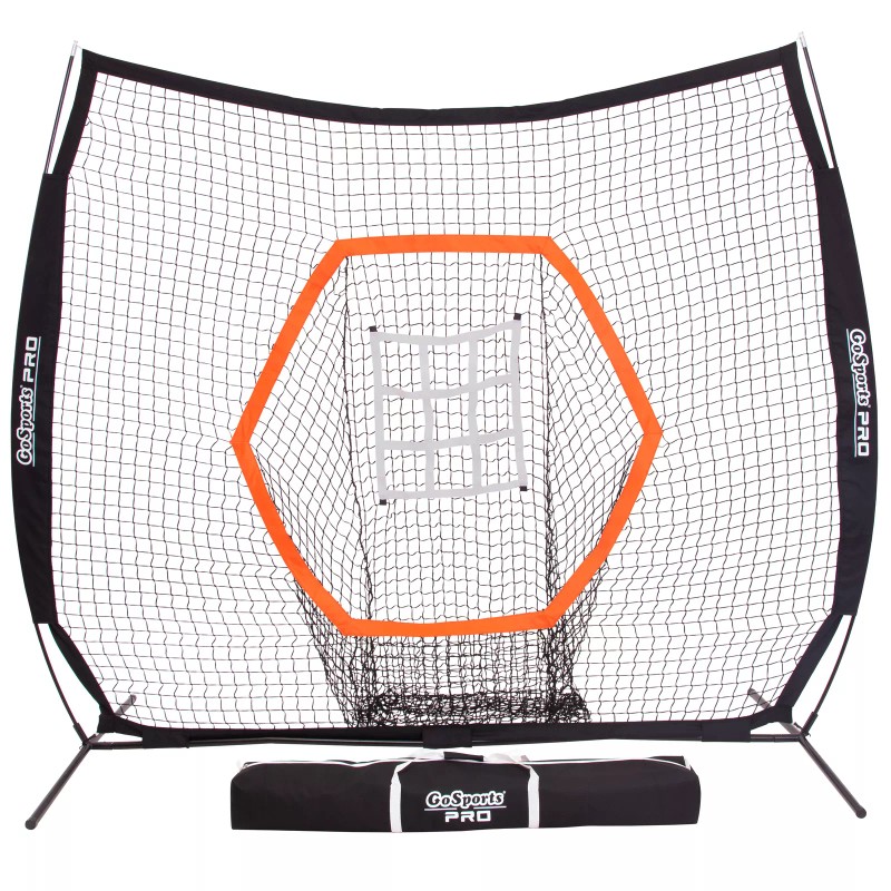 The GoSports 7'x7' PRO net builds upon our #1 selling GoSports 7'x7' baseball net and takes it to the next level with 2x stronger netting to make for the ultimate training net. The net is designed to help players train in several key areas: hitting: hit off a tee or have a coach lob balls to hit into the center part of the net. Players can focus on swing mechanics and technique without having to Shag balls. Pitching: each net includes an adjustable strike zone that attaches to the net so pitchers can dial in their various pitches without needing a catcher. Fielding: setup the net behind a base and practice fielding balls and throwing accurately into the center of the net. The distinctive hex shape pocket is designed to look good and stand out from the crowd while also collecting balls during practice. The net sets up in 90 seconds so it can easily be taken to fields for training, but it can also be used in your backyard. The net is made using a powder coated steel frame with a robust 8-ply net (2x stronger than standard) to withstand years of use. This is a must have for any coach looking to take their players to the next level.