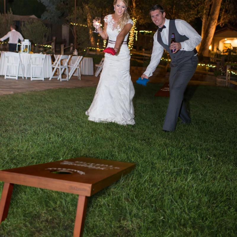 - PREMIUM STAINED FINISH: A classic dark brown stain finish gives this set an elegant look that captures the timeless fun of playing bean bag toss with friends and family. The wedding inscriptions in white lettering also congratulate the happy couple.