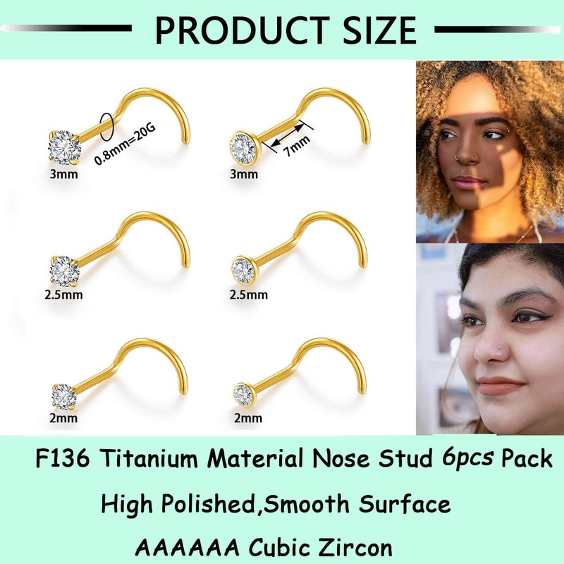 - Size: 6pcs Corkscrew nose rings studs gold set,20G (0.8mm), Pin Length: 6.5mm, 6A CZ top size: 2mm/2.5mm/3mm.