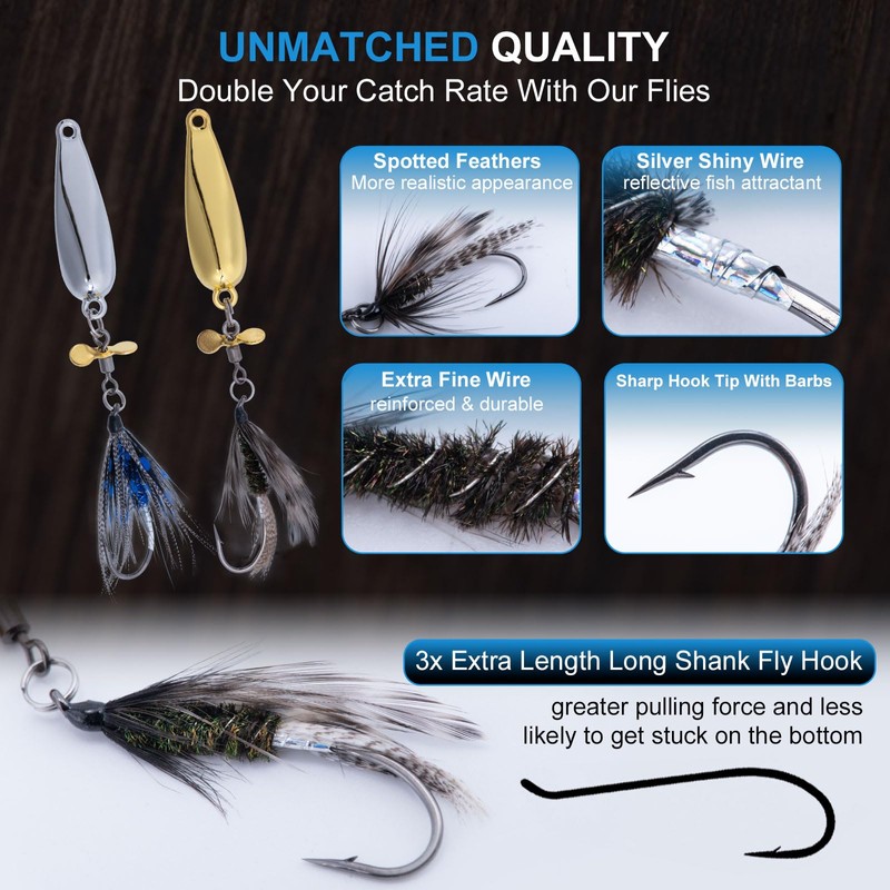 - Lifelike Flies for Natural Action: Hand-tied with natural spotted feathers and sliver shiny wire, the fly fishing flies section mimics real prey with smooth, flowing movement. This realistic presentation makes it a go-to choice for stream fishing, river fishing, and targeting wary species