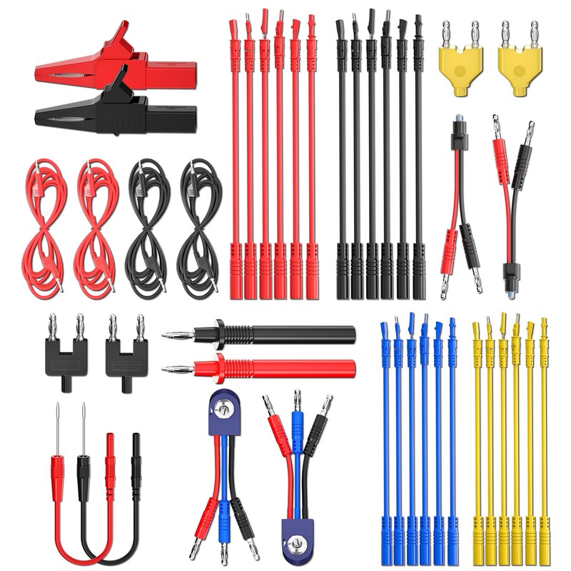 - Package include: 1 x black carrying case, 72 x test leads with terminals, 2 x LED stroboscopes, 2 x standard probes, 4 x acicular probes, 2 x SRS Connectors, 2 x 5KΩ potentiometers, 4 x 1-to-1 connectors, 2 x 1-to-2 connectors, 2 x alligator clips.