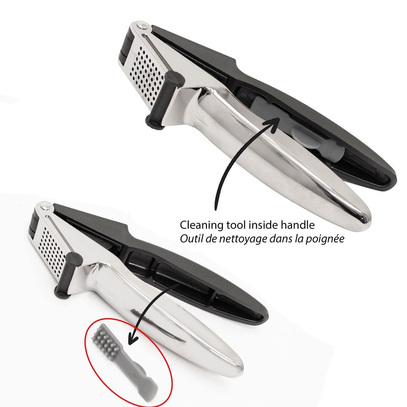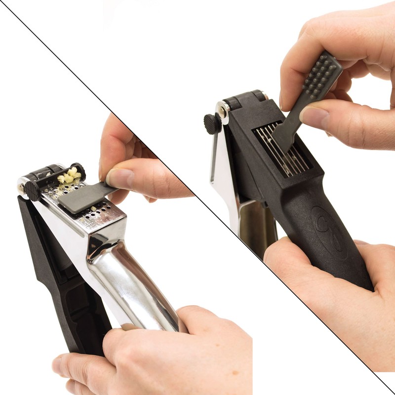- SCRAPER: Integrated scraper slides up and down to release excess garlic purée