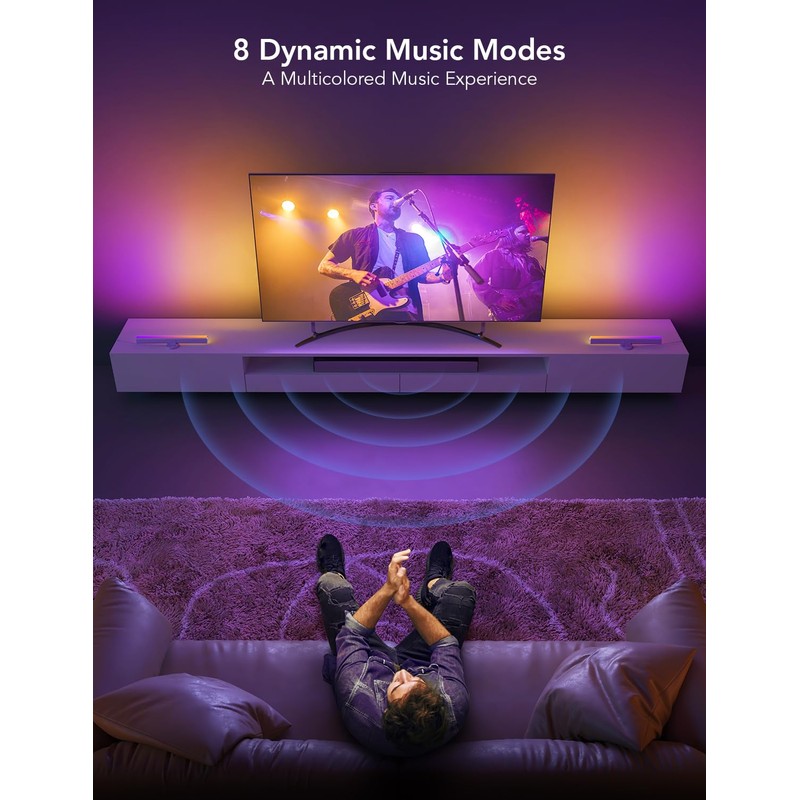- Dynamic Music Modes: Turn your LED TV light bars into a dance party using Music Mode on Govee Home App. Choose from 8 diverse music modes to create a lively party scene for your space with Govee RGBIC light bars.