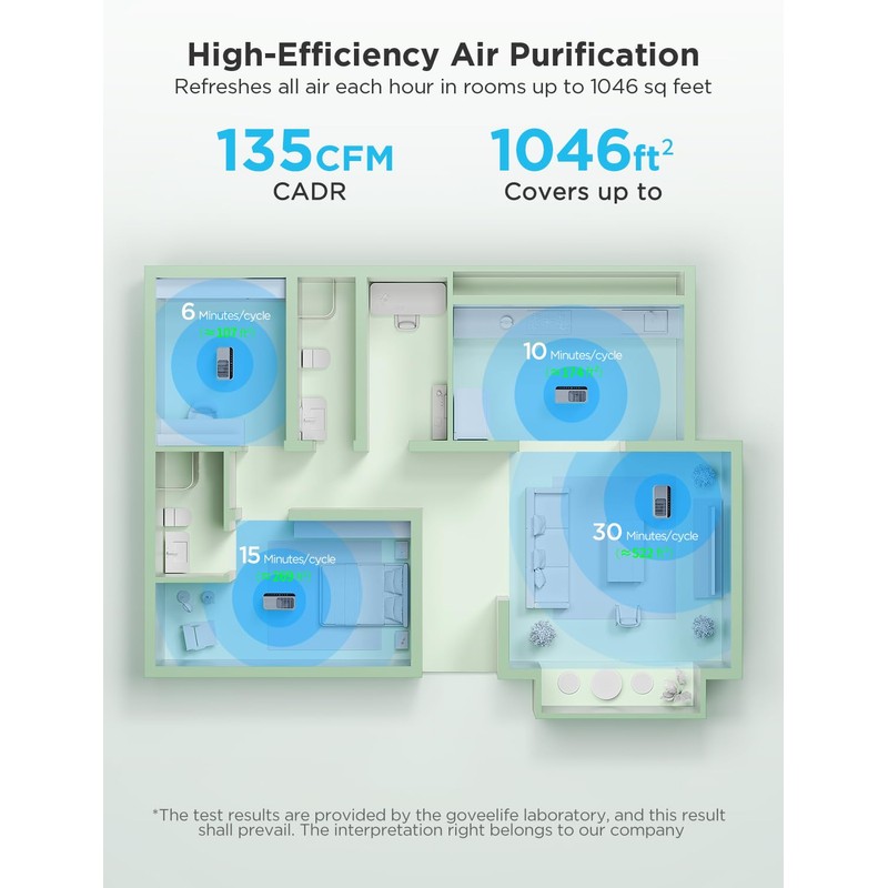 - Efficient Purification for Large Spaces: With a CADR of 135 CFM and advanced tech, Smart Air Purifier can effectively clean the air in a large 1046 ft² area once per hour, ensuring your home or office consistently benefits from clean, fresh air throughout the day.