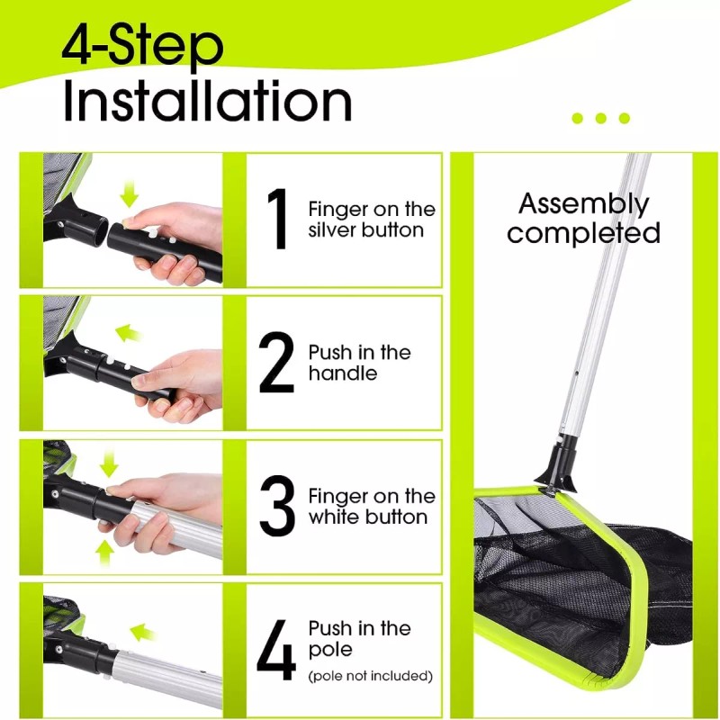 Nuestro skimmer para piscina se adapta a un poste de piscina telescópico estándar de 1-1/4" de diámetro (el poste no está incluido) para extender su área de alcance. Fácil instalación y extracción de la red para hojas de piscina sin herramientas ni tornillos complicados. Utilice esta red de malla fina para limpiar piscinas de hidromasaje, piscinas de spa, fuentes, estanques y piscinas para niños y adultos para tener una piscina ordenada.