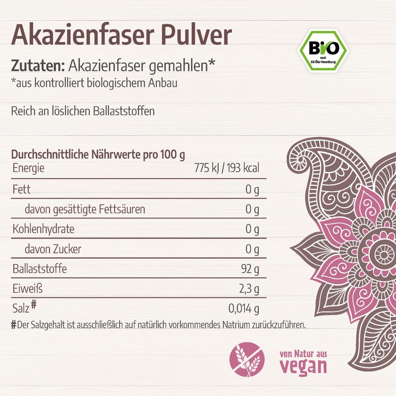 - Fibre-rich natural product – the Govinda organic acacia fibre powder is a natural and purely vegetable fibre source. It is extracted from the milk juice of acacia and then carefully dried and powdered.