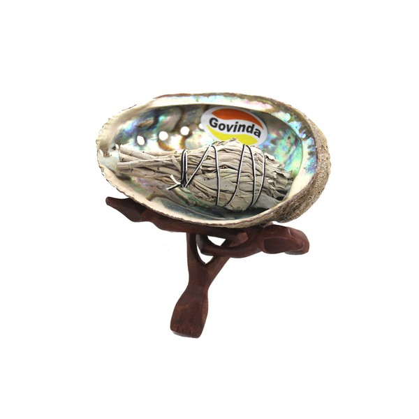 Govinda Pearlized Abalone Shell Smudging Kit with Wooden Tripod Stand & White Sage Stick