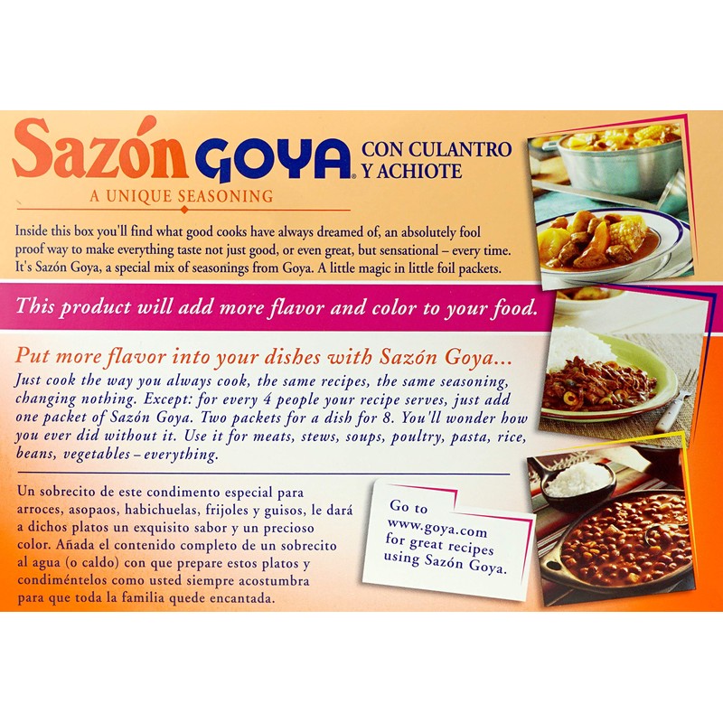 Goya Sazon with Corianto and Annatto - 6.33 oz. box, 15 per case Inside this box youll find the secret to creating the authentic flavors of Latino cuisine. Goya Sazons special blend of seasonings makes every dish it graces taste truly exceptional. Just one packet makes a world of difference. Jumbo Pack; 36 envelopes per box