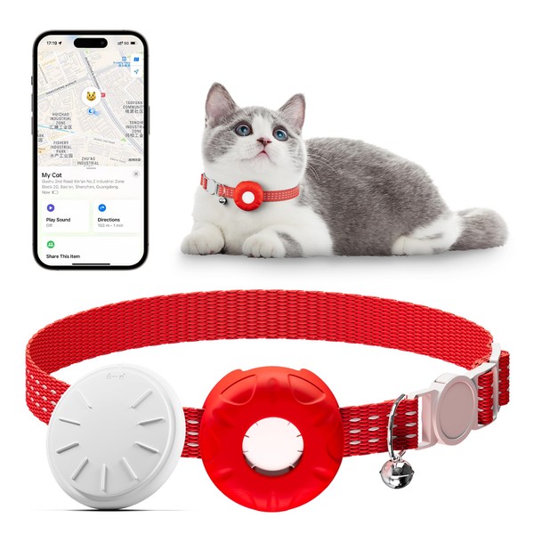 GPS Cat Tracker, Pet Tracker for Cats with Breakaway Cat Collar, Compatible with Find My App(iOS Only), No Monthly Fee (Red)