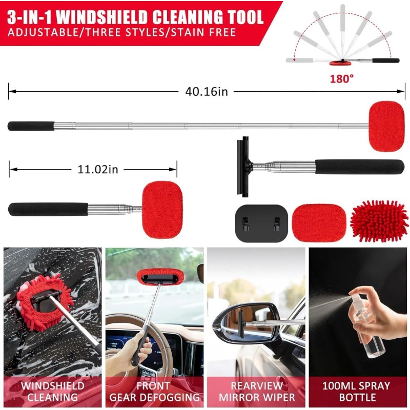 Complete Car Cleaning Kit: Complete Car Cleaning Kit: Including almost everything for the whole car washing, cleaning and detailing. The car vacuum with 15 ft cord and 120 W motor provides a super suction power of almost 7500 Pa to terminate any dirt, pet hair or debris. The 3-in-1 windscreen cleaner has three uses: scrubbing, defogging and scraping. Easily scrub windscreens or scrape water spray off mirrors