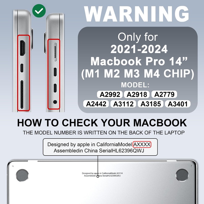 - Compatible Models: Compatible with 2021-2024 MacBook Pro 14 inch Pro/Max (Model: M4 A3112 A3185 A3401 / M3 A2918 A2992 / M2 A2779 / M1 A2442). Please note: Not compatible with 2016-2022 MacBook Pro 13.3 inch (model: A2338 / A2289 / A2251 / A1706 / A1708 / A1989 / A2159). Please check your model number before purchasing, the model can be found on the back of your laptop. If you have any questions about the purchased product, please feel free to contact us.