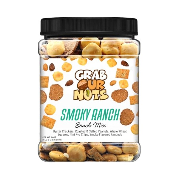 Grab Our Nuts Smoky Ranch Snack Mix 22 Oz Jar - Oyster Crackers, Roasted Peanuts, Whole Wheat Squares, Mini Rye Worcestershire Bagel Chips, Smoke Flavored Almonds