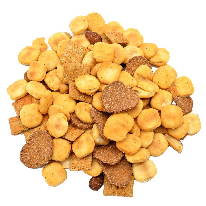 - PREMIUM SNACK MIX: Delicious combination of oyster crackers, roasted peanuts, whole wheat squares, mini rye worcestershire bagel chips, and smoke-flavored almonds. All coated in a smoky ranch seasoning in a convenient 22-ounce jar