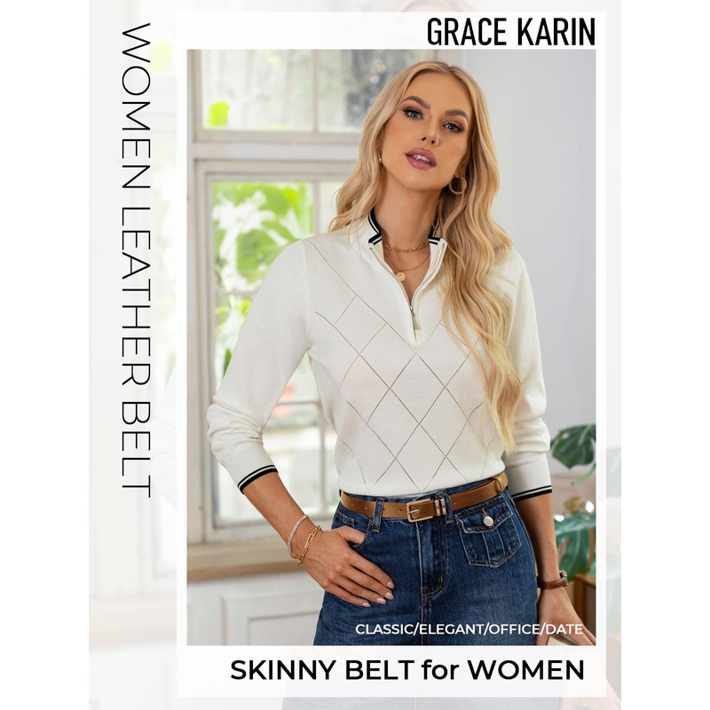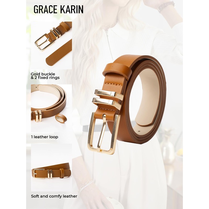 - 【Skinny Belts for Women】 Belt for women is made of high-quality PU leather, which is soft yet durable, ensuring long-lasting wear. The belt’s solid buckle is a metal alloy, and it has two fixed rings. The gold buckle adds a touch of elegance, making this belt stand out without being too flashy. The classic pin buckle with rust proof to keep bright shine.