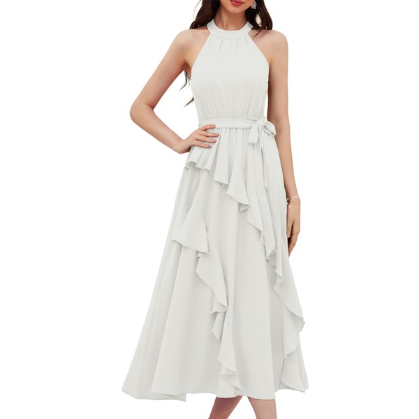 - Features: The summer maxi dress features halter neck, sleeveless, solid color, high waist, double layered ruffle hem, button closure, relaxed fit, perfect midi length can highlight the crus curve.Split at one side, tie-self belted. Our summer flowy dress will make you look wonderful, sexy and elegant.