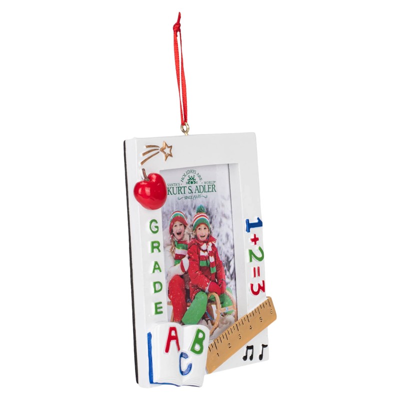 - This grade school picture frame ornament from Kurt Adler is a festive way to celebrate the grade schooler in your family. Decorated white frame features a book, ruler and musical notes with space that can be personalized using your own pen or marker