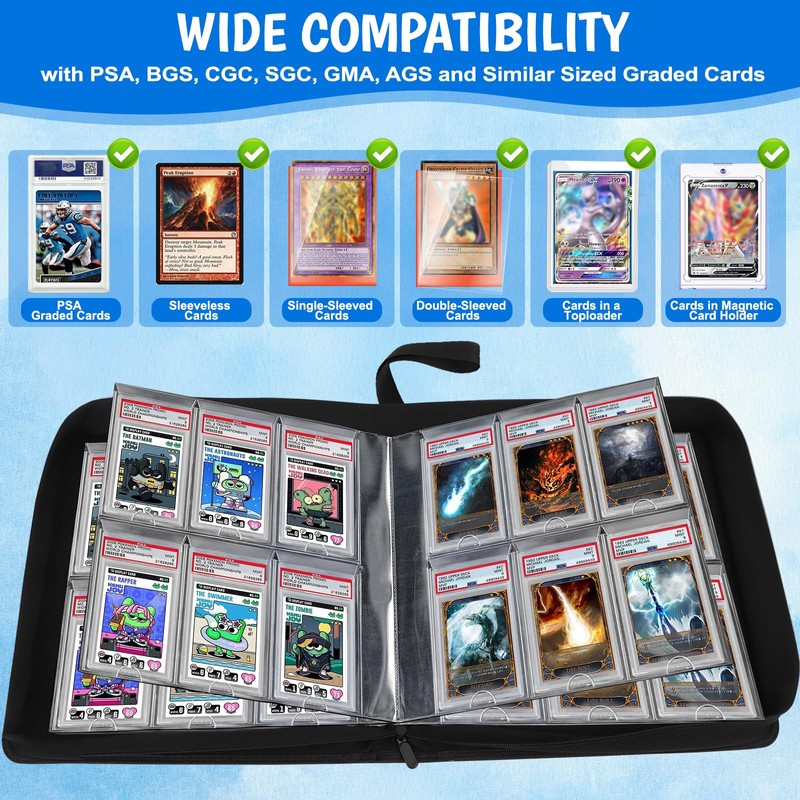 - ✅️【COMPREHENSIVE PROTECTION】The high-quality zipper of our trading card binder shell protects the graded cards and keeps them intact when not in use. Each pocket inside our card binder is designed with a dust cover, and there is a small hole at the bottom of the pocket, which is very convenient for you to take out the graded cards!