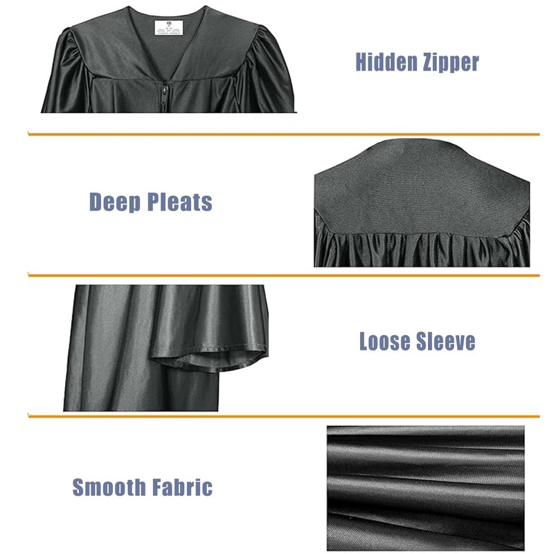 - Gown Material: Made of black quality 100% polyester fabric,shiny finish very kind of glossy look,breathable,light weight and comfortable