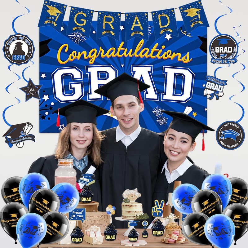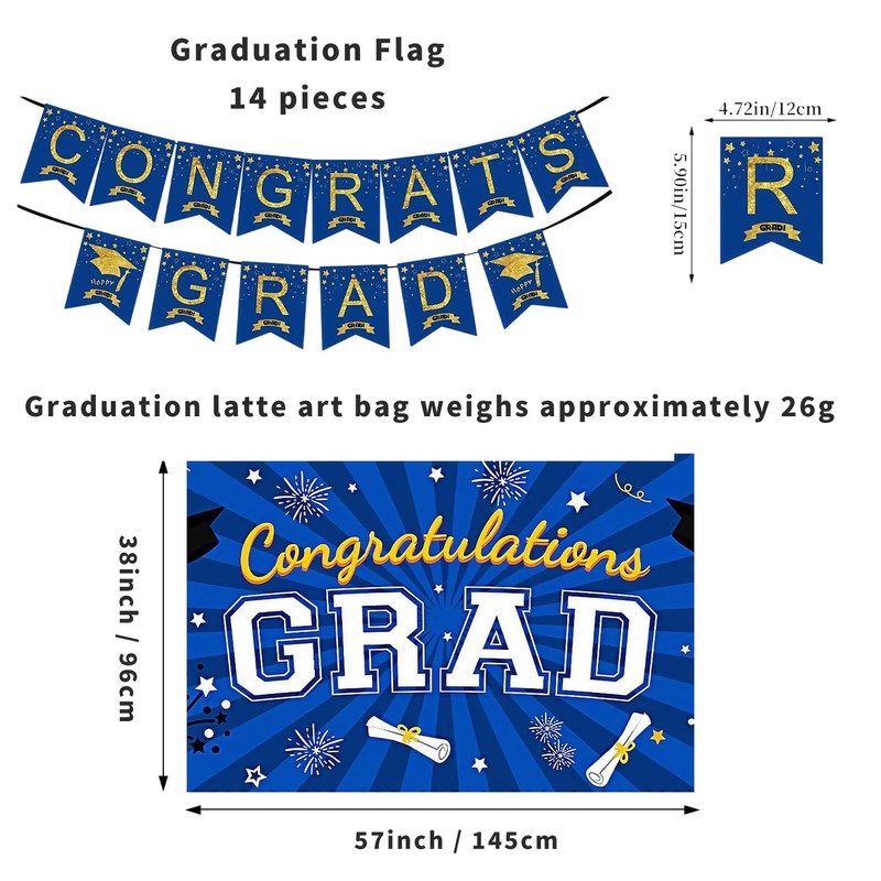 - 🎓 Complete 2025 Graduation Kit:Everything included: large "Congratulations GRAD" backdrop, "CONGRATS" & "GRAD" banners, themed balloons, cupcake toppers, and gradation handling swirl congrats grad. Perfect for photo booths, dessert tables, or venue entrances.