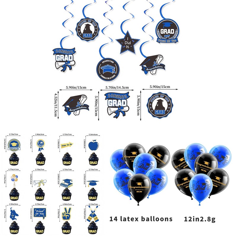 Bonus Accessories: 10 black cupcake toppers ("GRAD" design).6 Gradation handling swirl congrats grad,the elegant blue and gold color scheme perfectly captures the spirit of graduation, creating a solemn yet festive atmosphere..