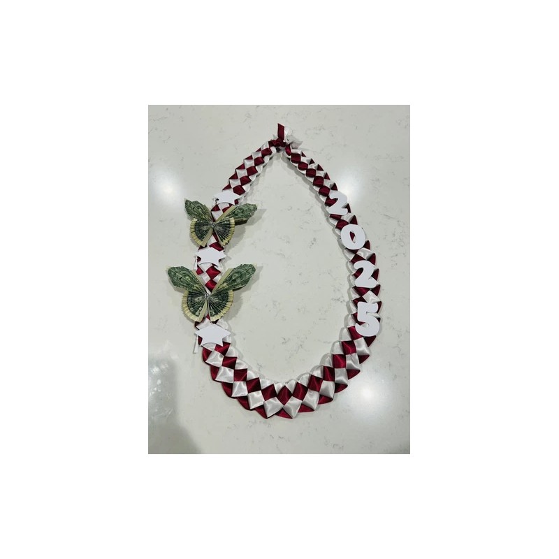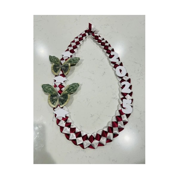 Burgundy and white satin lei with white letters and 2 money butterflies.