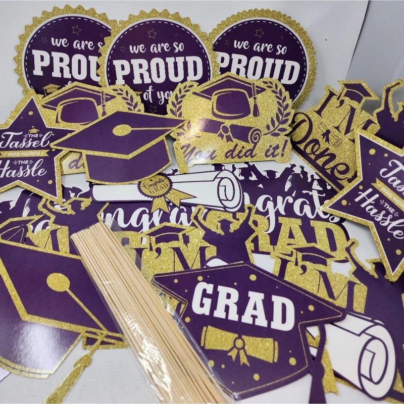 Elevate your graduation celebration with this 32-piece Purple & Gold Party Decoration Set! Perfect for adding a touch of elegance to your event, this set includes a variety of decorations featuring vibrant purple and gold colors. Each piece comes with sticks for easy display, making setup a breeze. Brand new and packaged, these decorations are ideal for creating a festive atmosphere as you celebrate your achievements. Make your grad party unforgettable with this stylish decor!