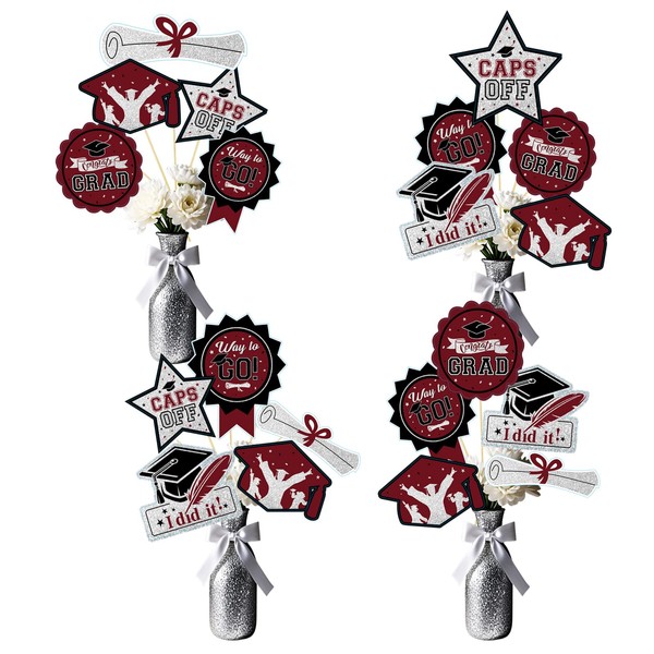 - 【Maroon Black Silver Graduation Party Centerpiece Sticks】This set includes 12pcs double-sided printed cards. It also comes with 12 wooden dowel sticks and non-trace glue points for easy assembly. Perfect for your class of 2025 maroon black graduation party decoration burgundy black needs. Stylish Centerpieces: This set includes 12 maroon graduation party centerpieces with 6 unique styles, each style featuring 2 pieces for a total of 12 pieces.