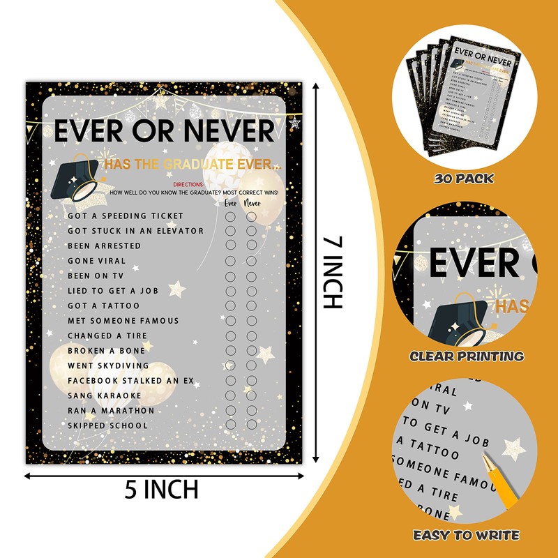 - Quantity & Size: Our graduation game cards include 30 game cards. The theme of the game is “EVER OR NEVER”. Each Card measures 5x7in with trendy black, white, and gold.