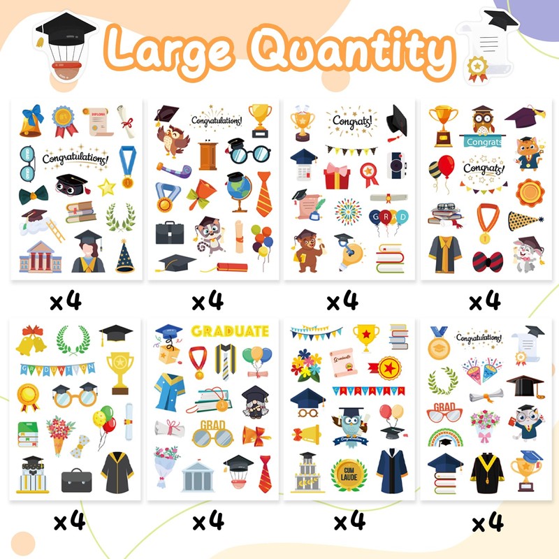 8 differents styles 32 sheets total 448 Pcs graduation stickers in 14 unique designs.