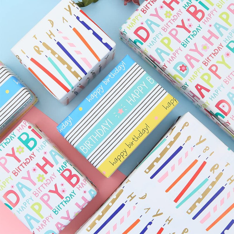 - Gift Wrapping Supplies Set - Includes 6 sheet 3 styles 27" x 19" 80gsm “HAPPY BIRTHDAY” letter gift wrapping paper with 1pcs 6.56 feet yellow ribbon.