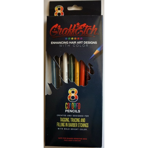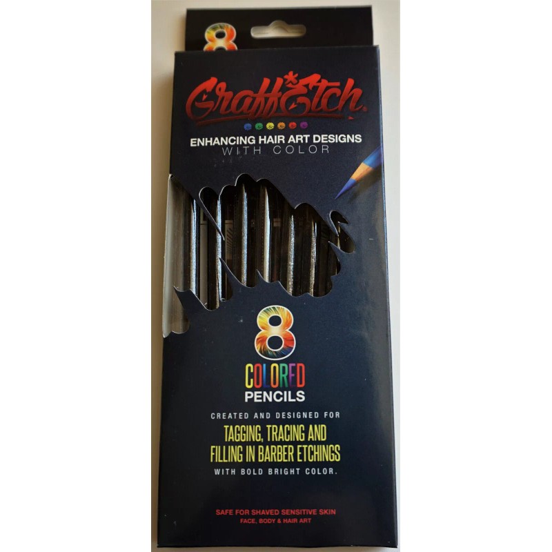 Graff Etch was created to combine graffiti art and barber etchings. Hair Art was once considered a fad but has now become as main stream as tattoos. When barbers and stylists create hair art, they are creating a design in the hair with their trimmers & razors. These designs can be geometric, sports and company logos, cartoon characters and even famous faces. The artists that design hair art are incredibly talented. Some barbers and stylists use their imagination or have a vision in their mind, some duplicate from pictures and advertising materials. GraffEtch color pencils are used to color in the designs to make them stand out. GraffEtch pencils were created for newly shaved sensitive skin. They are not ordinary eyeliner pencils. They were specially formulated to apply on a tender scalp, the face, body and on short hair. The colors are blend able so any color you need can be created from the 16 total colors. Each box contains 8 pencils, a poster and a sharpener is built into each cap. There are 5 styles to choose from. Use these pencils to pre-draw your design before etching them out. You can fill in hair lines, beards and create sharp angles. GraffEtch has the proper combination of texture, long lasting wear and ease of application. They apply creamy smooth, won’t drip down if you sweat and will stay-put until washed out with shampoo or a cleanser. Graff Etch pencils were created because barbers and stylists needed proper tools to be more creative. It's a fun and temporary way to express yourself.