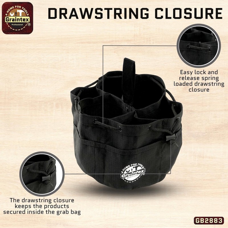 - DRAWSTRING CLOSURE: : Grab bag has easy lock and release spring loaded drawstring closure. The drawstring closure keeps the products secured inside the grab bag