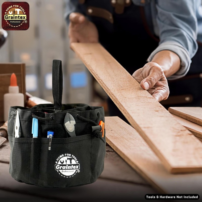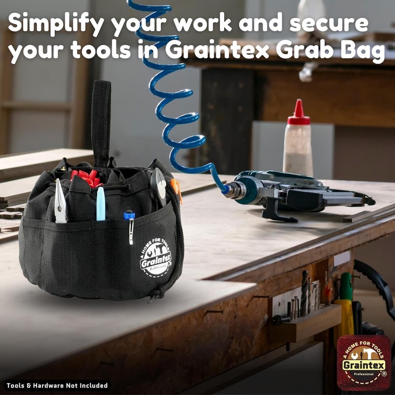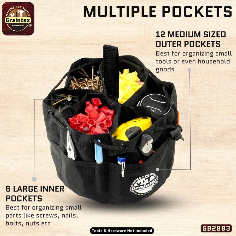 - MULTIPLE POCKETS: : Grab bag is divided into 6 large inner compartments and 12 medium sized outer pockets. The six large inner compartments and 12 medium sized outer pockets can easily organize and store assortment of small parts like screws, nails, bolts and nuts, small tools or even household goods