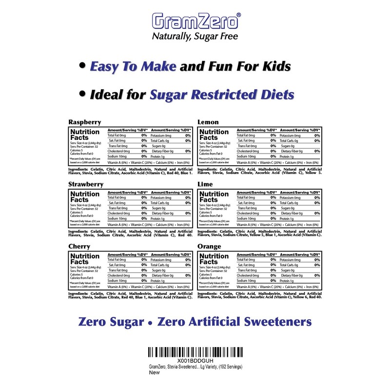 GramZero Lg Variety Gelatin Mix, 6/1 Gallon Yield (192 - 4 oz servings), Stevia Sweetened, SUGAR FREE