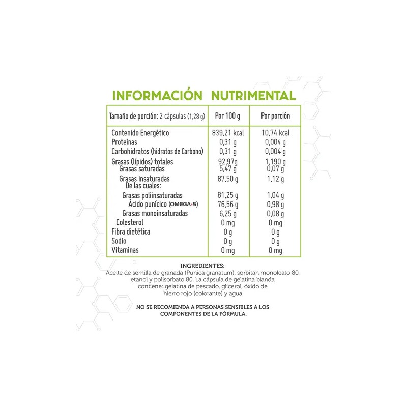 OMEGA 5 Y ÁCIDO PUNÍCICO: Contiene la mayor concentración de ácido punícico (por dosis diaria) en forma de nano-gotas.