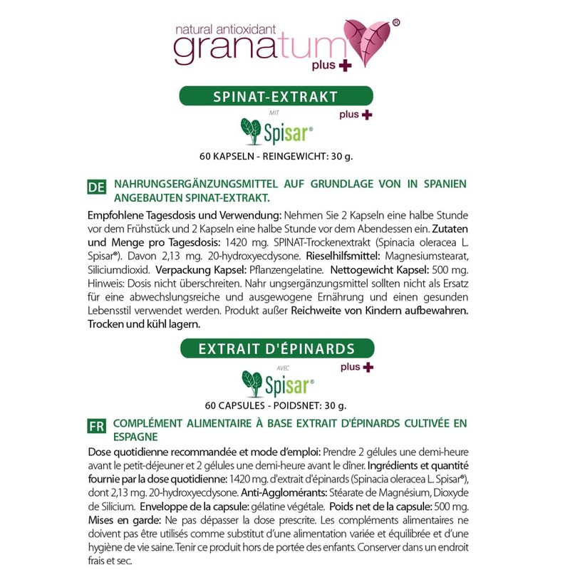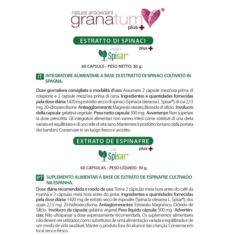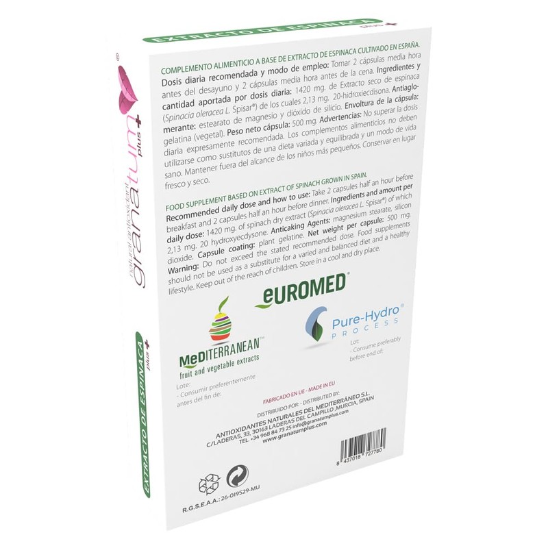 Granatum Plus Spinach Extract Spisar 20-Hydroxyecdyson Polyphenols Origin Spain (4 Boxes of 60 Capsules)