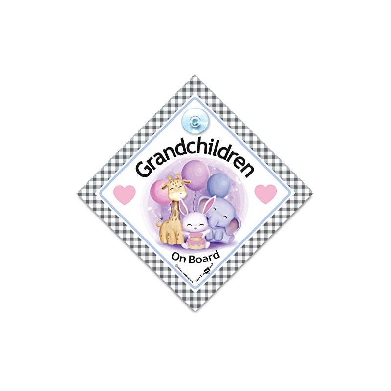Grandchildren On Board Car Sign Cute Animals, Baby On Board Sign, Grandchild On Board, Designed to Let Other Road Users a Child is in The Car, 14 cm x 14cm x 2cm