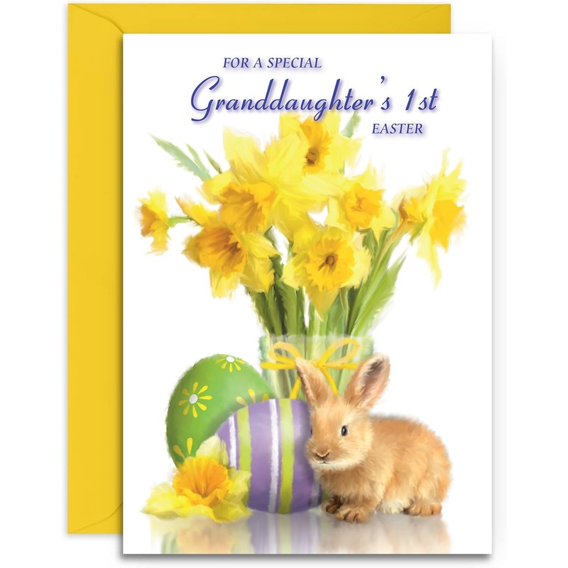- PLEASE NOTE : This design is reproduced from an original Acrylic painting by artist John Williams. It has loose brush strokes as pictured and is not intended to look like a crisp photograph. Please search for our other Easter cards if this style is not to your liking. Granddaughter 1st Easter Card ✩ Easter Wishes ✩ Medium Size – A5 (148 x 210mm) with C5 Envelope.