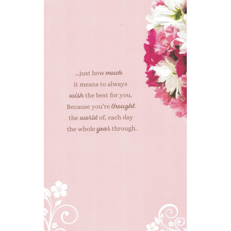 • DESIGN: Beautiful pink-themed birthday card featuring elegant floral artwork with white daisies and pink roses in a glass vase against a soft pink background
