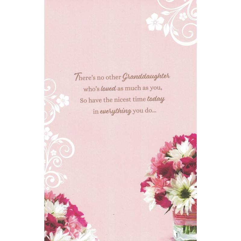 Celebrate this momentous milestone with our beautifully designed 21st birthday card for a cherished granddaughter. This premium greeting card features an elegant pink design adorned with stunning white daisies and pink roses in a glass vase, complemented by delicate floral accents and sophisticated swirl patterns. The card includes a generous 8-page insert, providing ample space to write your heartfelt wishes and share precious memories. The front showcases elegant typography with 'To A Wonderful Granddaughter' and includes a touching verse that reads 'Today's the perfect time, now your Birthday's here, To wish you every happiness to last throughout the year.' The card's high-quality paper stock and professional printing ensure your special message will be treasured for years to come. Perfect for marking this significant birthday celebration with style and sentiment.