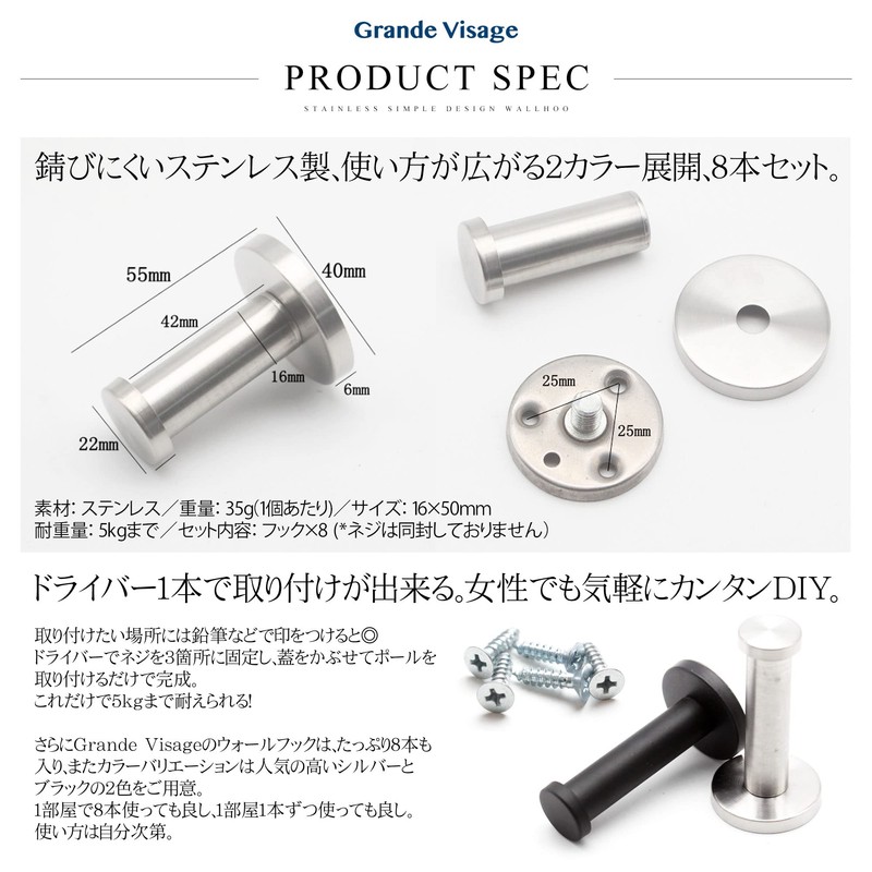 Grande Visage Stainless Steel Hooks, Wall Hanging, Strong Wall Hooks, Simple, Screw Mounting, Set of 8, Bulk Purchase (Black)