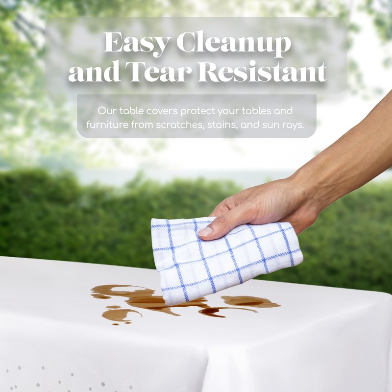 - 🍒 PERFECT FIT: 54" x 108" - covers any table up to 8 ft. You can also cut it to fit a smaller table. Budget Friendly. Featuring a fade and tear resistant tablecloths, our rectangle table covers easily protect your tables and furniture from scratches, stains and sun rays. Inspires a clean sense of style at any event or meal you’re hosting with these elegant tablecloths disposable.