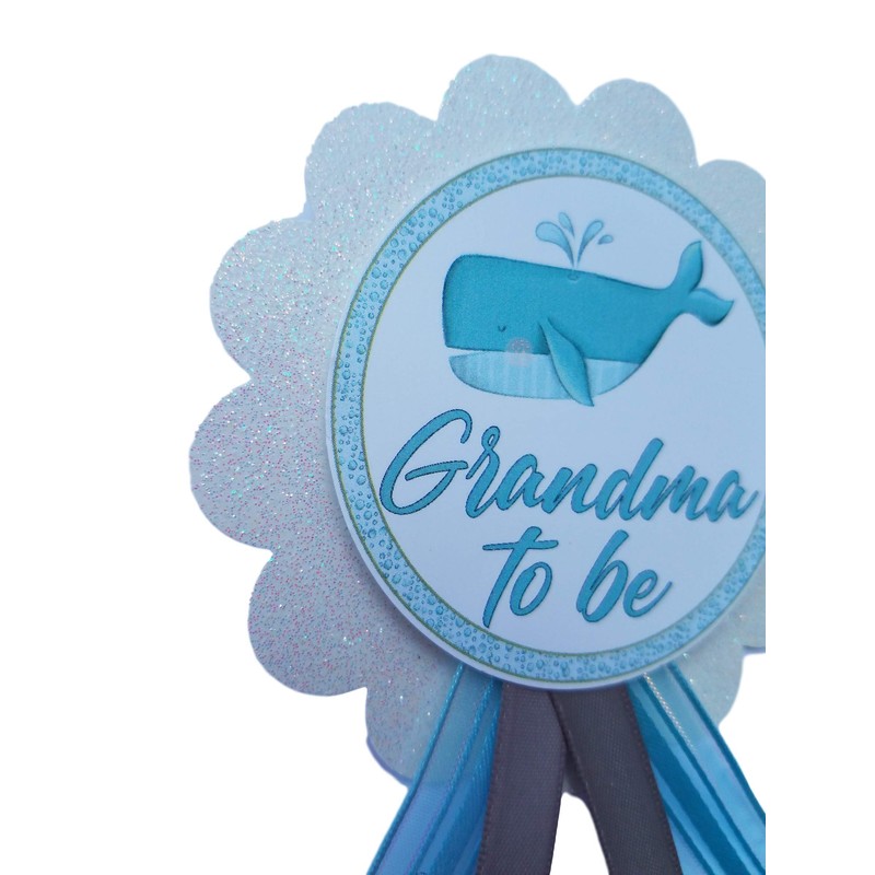 - "Grandma to be" Pin with white glitter backing, layered with blue and gray satin ribbons, featuring an adorable whale print. SIZE – Measures approx 5" long x 3.5" wide includes a safety pin back closure.