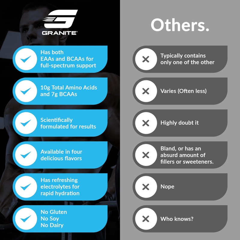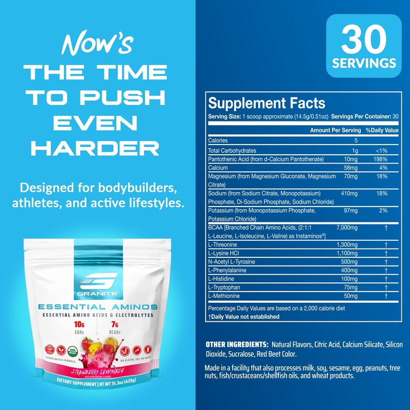 - ➤ REFRESHING ELECTROLYTES – EAAs advanced electrolyte complex helps replace the electrolytes you lose after a good, sweaty workout. Scientifically formulated for rapid rehydration, Granite Supplements EAAs deliver the perfect balance of electrolytes so you can rehydrate quickly, no matter how hard you workout.