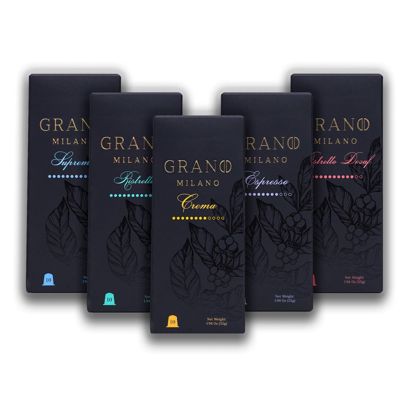 - Grano Milano Variety Pack Coffee Capsules, 5 boxes - each contains 10 pods: Ristretto, Supremo, Crema, Espresso and Ristretto Decaf — 50 pods in total (40 caffeinated, 10 decaffeinated)